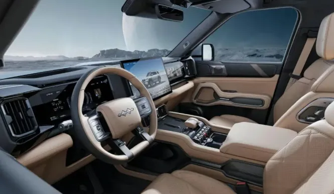 动力是2.0T插混,前后双电机,综合功率很强。电池是磷酸铁锂刀片电池,具体容量还没公布。底盘是前后双叉臂,高配会有云辇-P液压车身控制系统,加上三把锁,越野能力很让人期待。