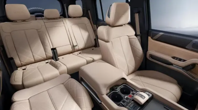 内饰还是“星舰”风格,中控布局和豹5很像,四辐方向盘、悬浮大屏、可升降挡把都没缺席。不一样的是,豹8给副驾也配了娱乐屏。座椅有6座和7座可选,7座是2+3+2布局,6座第二排带独立扶手。地台是全平的,进出第三排比较方便。