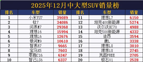 要说2025年竞争最为激烈的细分领域那非中大型SUV市场莫属,在这一年中大型SUV市场不仅推出了大量有着强大竞争力的新车型,而且有多款经典车型进行了改款升级,同时推出后的市场销量都非常出色,这就导致了新老豪强出现了激烈的销量争夺,市场格局也随之发生大洗牌。据最新公布的2025年12月中大型SUV销量榜显示,在市场下行的不利背景下,榜单仍有6款车型销量突破万辆大关,交出了令人满意的答卷。小米YU7再次摘得桂冠,钛7未能登顶,问界M7稳居前3,理想i6和理想L6携手入榜前5,银河M9、宝马X5、智界LS6都跻身前10,承载着大量越野爱好者情怀的普拉多已退居榜单前20名,不过2400多辆的销量依然证明了其在国内市场占有一席之地。中大型SUV大洗牌!12月销量榜,钛7丢冠,理想L6第5,普拉多第21名从榜单来看,榜单前20名位置基本都被打乱,昔日稳居榜首的理想L6(12676辆)已退居第5,冠军位置已被小米YU7(39089辆)稳稳的拿下,钛7再次屈居第2,不过销量已经来到了34086辆,问界M7也重回巅峰,本月售出29368辆,前3名本月销量均创历史新高,值得肯定。理想再次加强了在中大型SUV领域的实力,如今已有理想i6、L6、L7、L8、i8五款车型同台竞技,而且市场表现都还不错,均入榜前20名,银河M9表现稳定,本月再次交出了万辆的好成绩,宝马X5、途昂是唯二跻身榜单前列的燃油车,两者合计销量也超过了10000辆,也是燃油车中为数不多的亮点。榜单中后段销量差距更为明显,普拉多、领克09都超2000辆,魏牌蓝山、豹8表现中规中矩,小鹏G9、探险者、奥迪Q6都仅有千辆出头,探陆、海狮07DM-i、星纪元ET都无缘榜单前40名,而自第57名开始后续有15款车型月销都不足百辆,不仅有传统燃油车北京越野BJ60、领地、昂科旗等,也有新势力车型智己LS7、飞凡R7、蔚来EC7,市场销量出现了明显的两极分化。