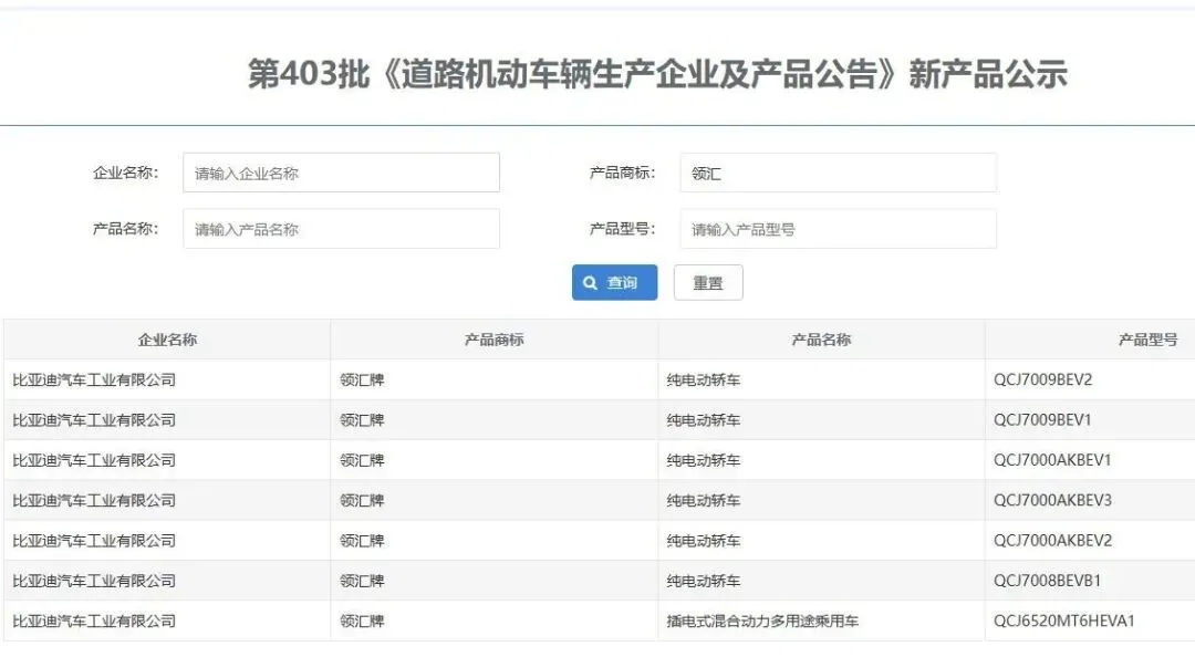 近日,工信部发布的《道路机动车辆生产企业及产品公告》显示,比亚迪旗下新增一个全新的汽车品牌“领汇”,寓意“领先”、“汇聚”资源。