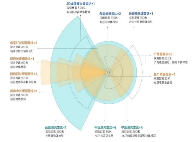 - 传感器系统:6 大类 34 个量产传感器(含 9 颗激光雷达、14 颗摄像头、4 颗毫米波雷达等),实现 360° 无盲区感知,最远探测距离 650 米