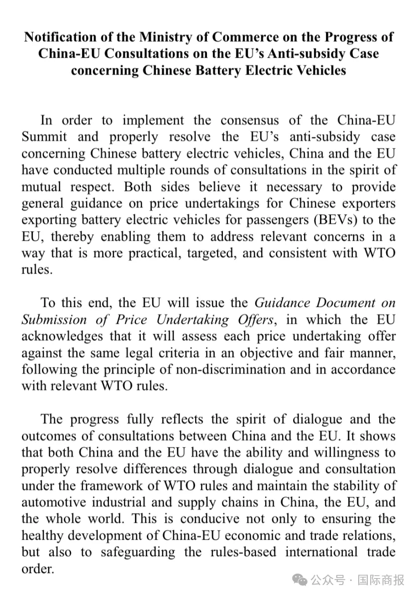 商务部表示,这充分体现了中欧双方的对话精神和磋商成果。中欧双方有能力、有意愿,在世贸组织规则框架下,通过对话磋商妥善化解分歧,维护中欧及全球汽车产业链供应链稳定。这不仅有利于中欧经贸关系健康发展,也有利于维护以规则为基础的国际贸易秩序。通报附件如下: