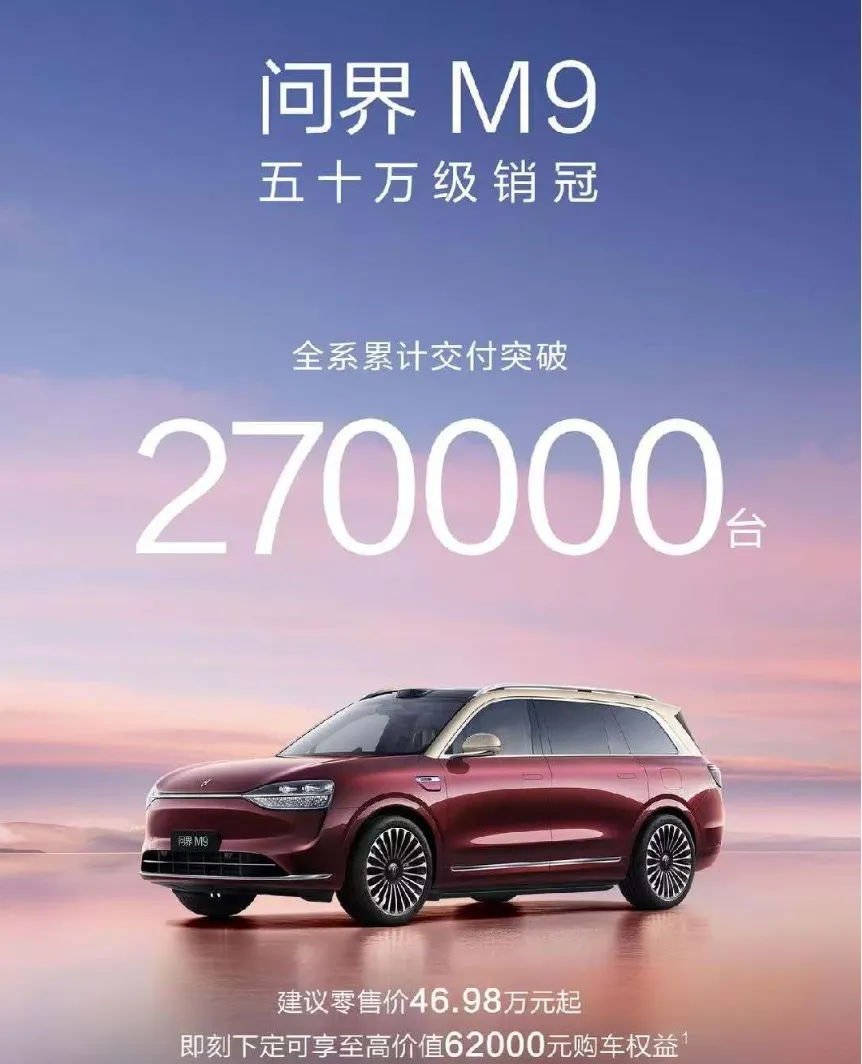 2025年,问界M9斩获50万级豪华车销量冠军,截至1月13日,累计交付量已突破27万辆,每卖出10台50万级豪华新能源,就有7台是问界M9,成为消费者9系旗舰车型“绕不开的选择”。