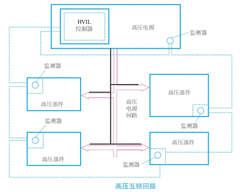 高压系统相应的线束插接器在高压电未被断开的情况下不允许断开。但也会有工作人员疏忽和非工作人员强行拆开的情况,为防止电击伤,在高压系统线束插接器上设计有高压互锁开关,只要插接器被断开,互锁电路便会断开,控制器监测到互锁信号断开,将在极短的时间内断开系统的主继电器,切断高压供电,可以避免意外电击发生。高压互锁回路如下图所示。
