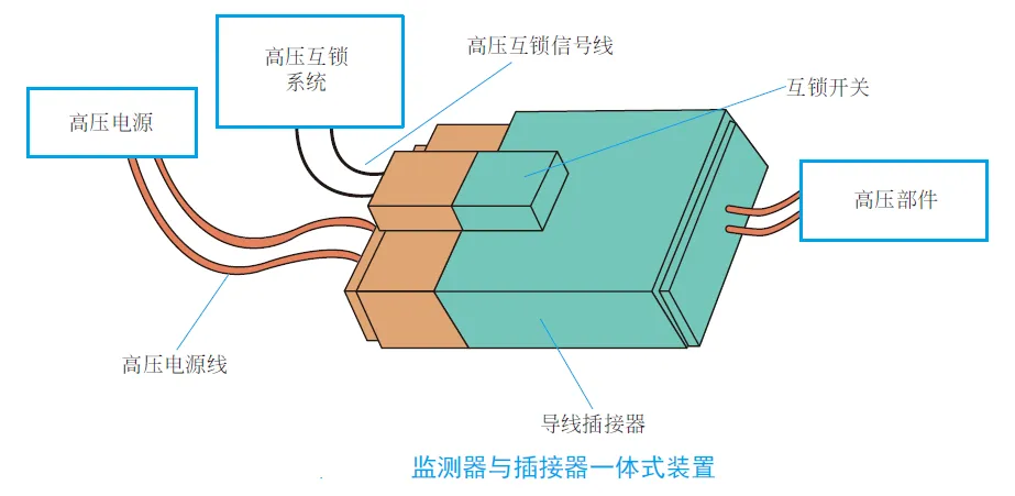 当整车发生碰撞时,碰撞传感器发出碰撞信号,触发HVIL 信号,整车高压电源会马上自动断开,以保障驾乘人员的安全。下图所示为监测器与插接器一体式装置。