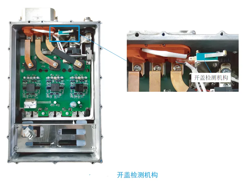 部分电动汽车的重要高压系统组件具有开盖检测功能,当发现这些组件的盖子在整车高压回路连通的情况下打开时,会立即向控制器发送信号,控制器监测到互锁信号断开,将在极短的时间内断开系统的主继电器,切断高压供电,同时激活主动泄放,在极短的时间内将高压系统组件内的电压泄放到安全电压。开盖检测机构如下图所示。