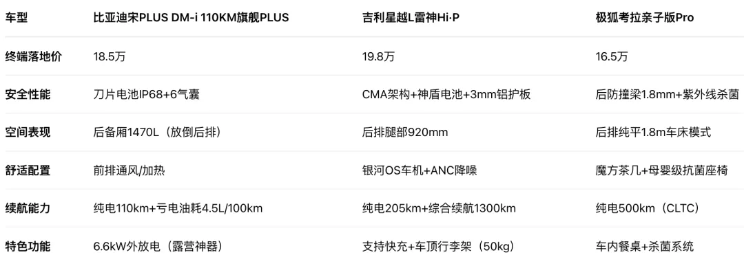 露营全能王 → 宋PLUS DM-i(18.5万级外放电+刀片电池,安全与功能兼得);
