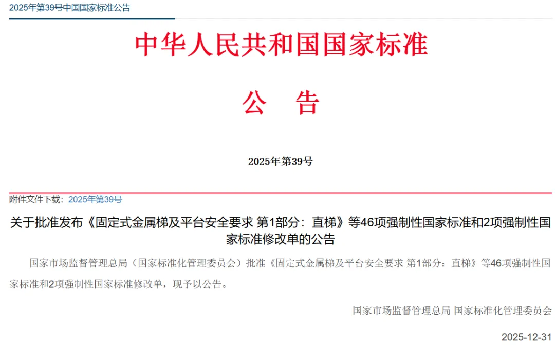 根据2025年第39号国家标准公告,国家市场监督管理总局(国家标准化管理委员会)批准发布46项强制性国家标准,其中包括1项电动汽车相关的国家标准,该标准将于2026年7月1日实施。