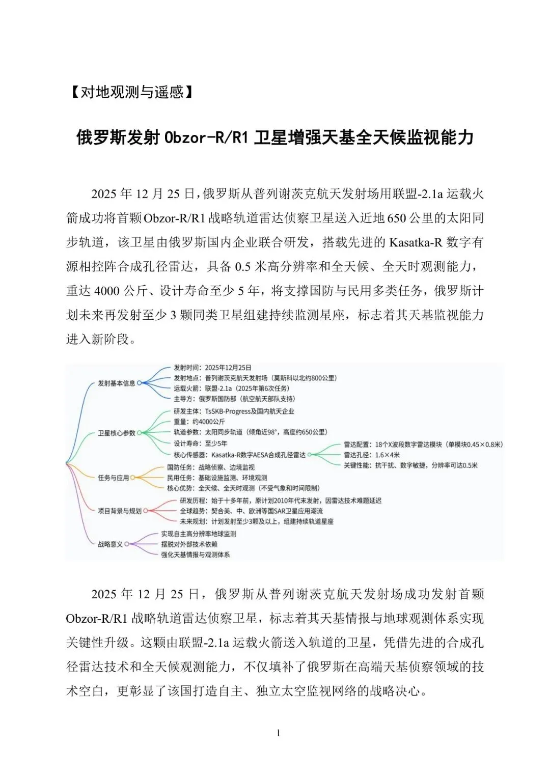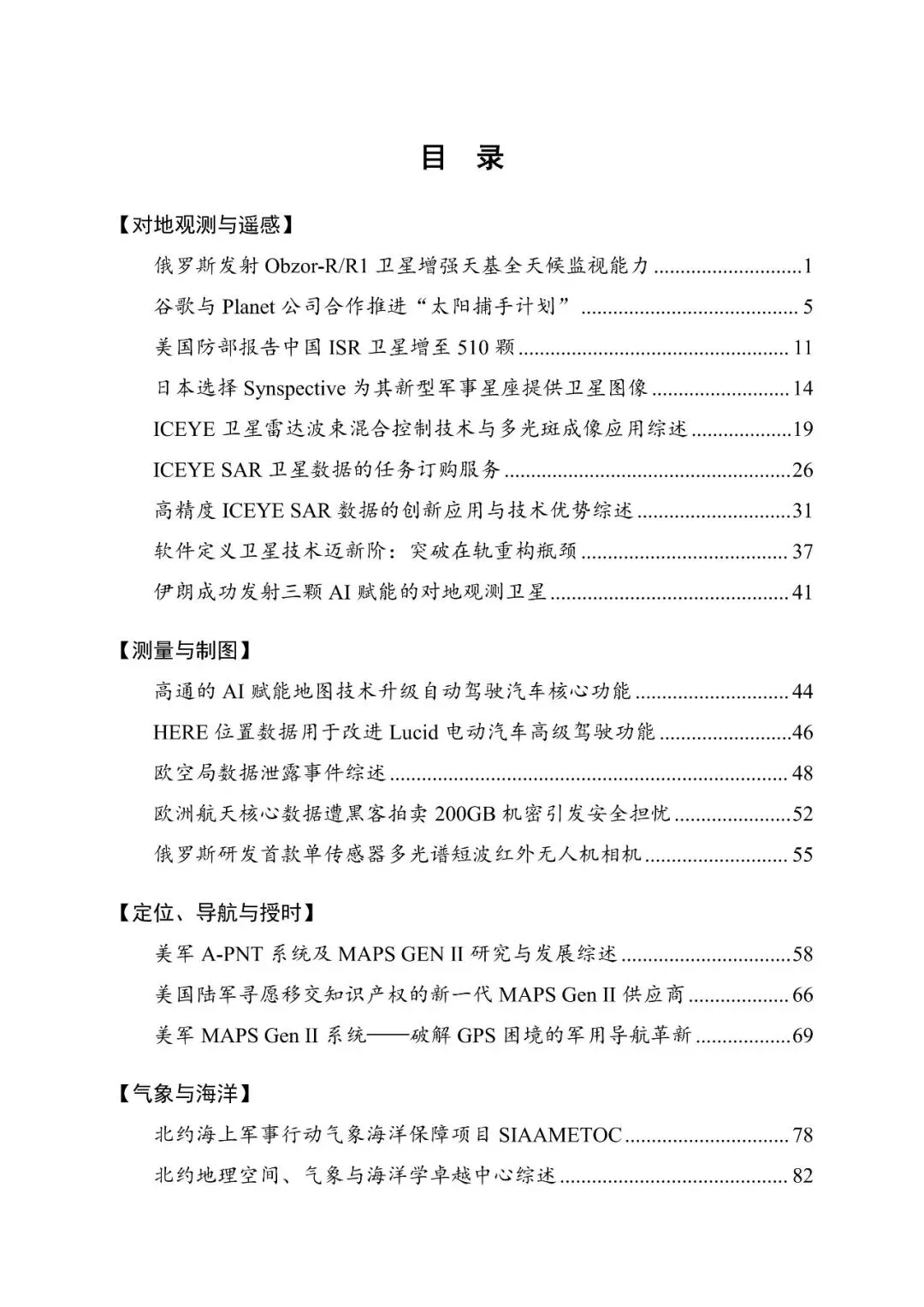 本期内容涵盖四大核心板块:对地观测与遥感领域,收录俄罗斯Obzor-R/R1战略雷达卫星发射、谷歌与Planet公司“太阳捕手计划”、美国防部披露中国ISR卫星规模等重磅资讯,同时介绍ICEYE卫星波束控制技术、软件定义卫星进展等技术成果;测量与制图板块聚焦AI赋能地图技术升级、欧洲航天数据安全事件及俄罗斯新型无人机相机研发;定位导航与授时板块详解美军A-PNT系统及MAPS Gen II的研发、列装与技术革新;气象与海洋板块重点呈现北约SIAAMETOC项目及地理空间气象海洋学卓越中心的建设应用。