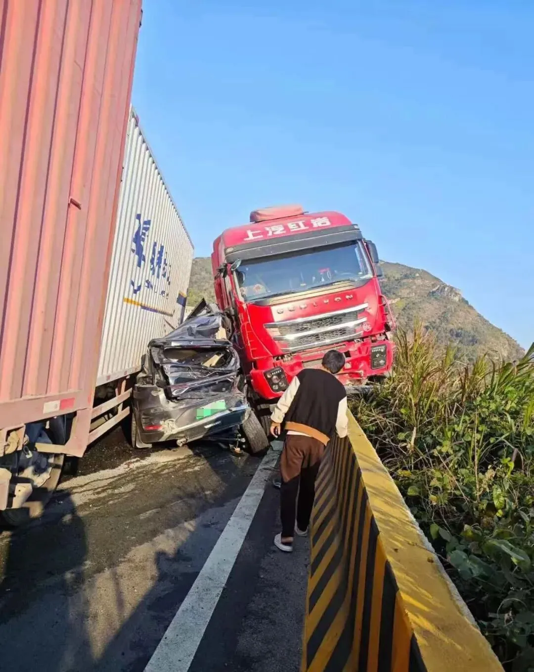 一辆白色轿车车尾出现明显凹陷,受损程度不轻;而前方的一辆黑色轿车,不幸被两辆货车前后夹击,车身遭到严重挤压变形,几乎难以辨认原貌。