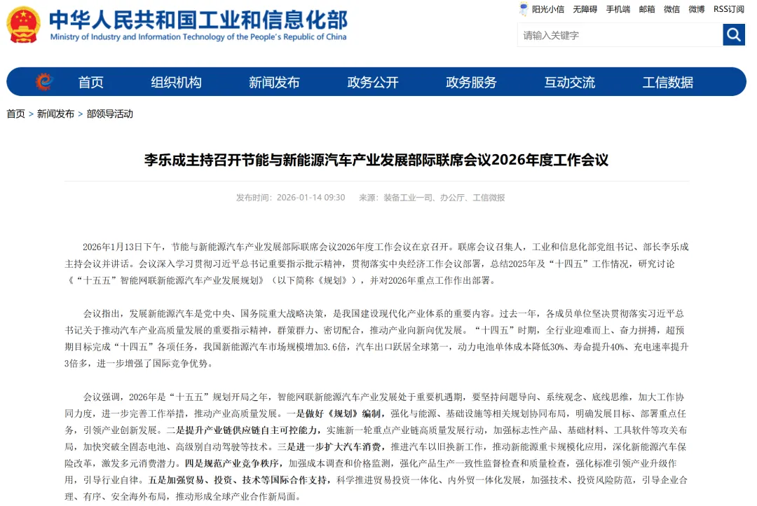 2026年1月13日下午,节能与新能源汽车产业发展部际联席会议2026年度工作会议在京召开。联席会议召集人,工业和信息化部党组书记、部长李乐成主持会议并讲话。会议深入学习贯彻习近平总书记重要指示批示精神,贯彻落实中央经济工作会议部署,总结2025年及“十四五”工作情况,研究讨论《“十五五”智能网联新能源汽车产业发展规划》(以下简称《规划》),并对2026年重点工作作出部署。