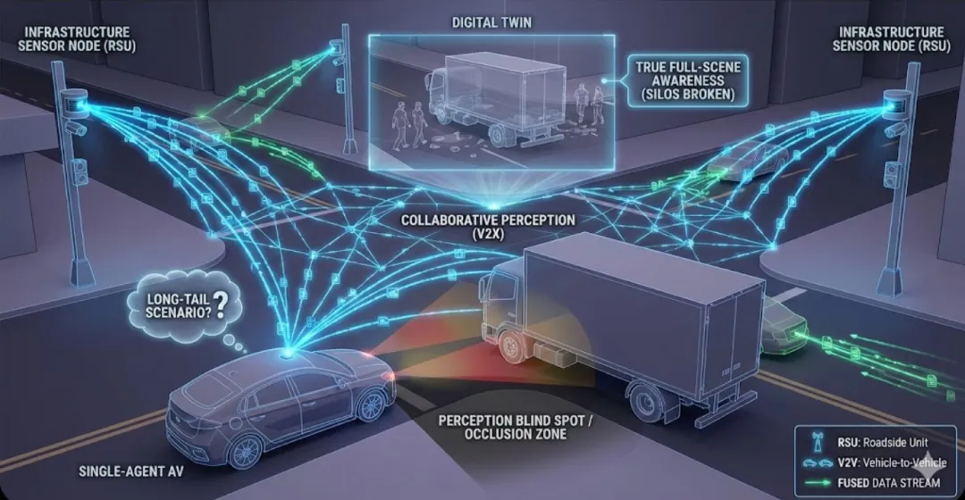 在我看来,车路协同感知(Collaborative Perception)不是一个“备选项”,而是通往高级别自动驾驶的“必经之路”。 这种技术通过打破单车的感知孤岛,利用多个智能体(包括其他车辆、路侧基础设施等)进行信息互补,从而实现真正的全景视野。