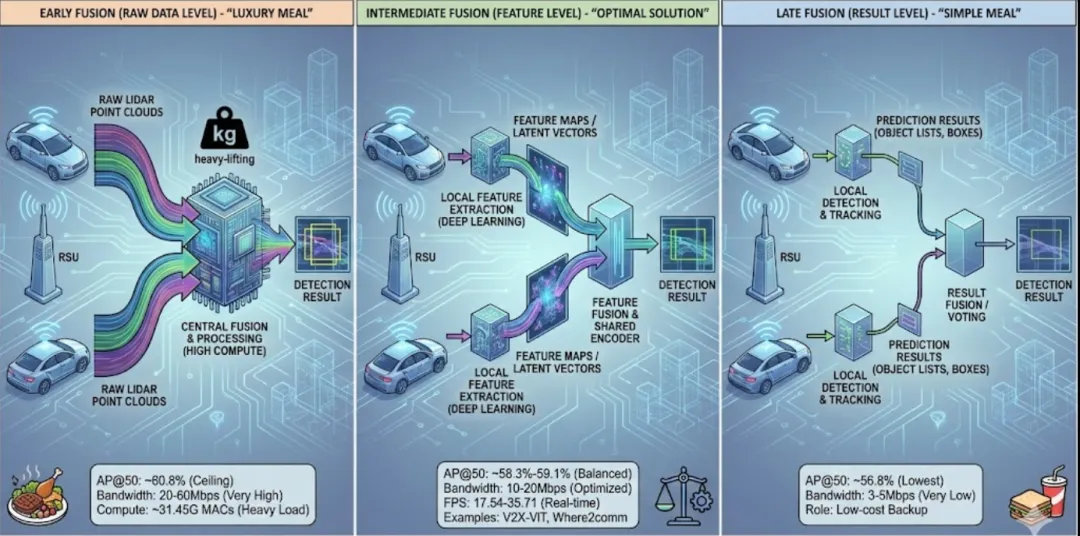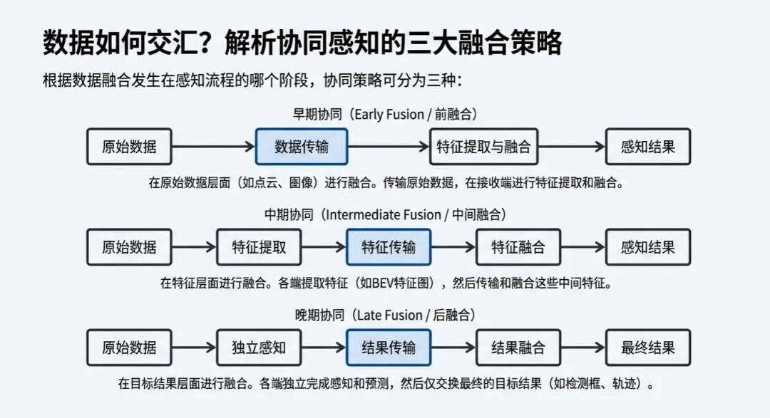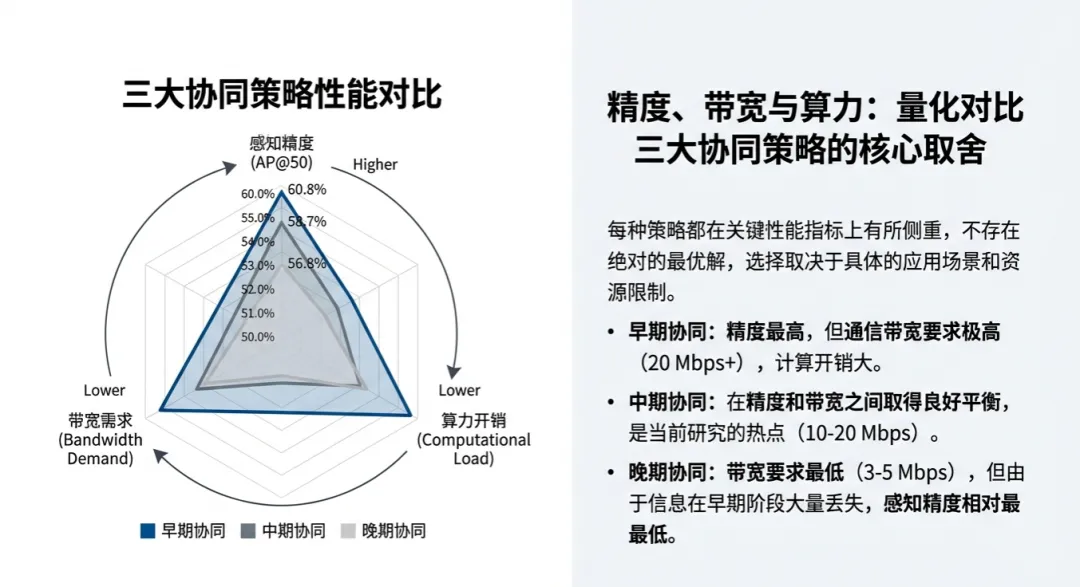 很多技术解读在谈到协同策略时,只是简单列举。但从工程落地的角度看,这实际上是一个在通信带宽、计算延迟与感知精度之间的残酷博弈。