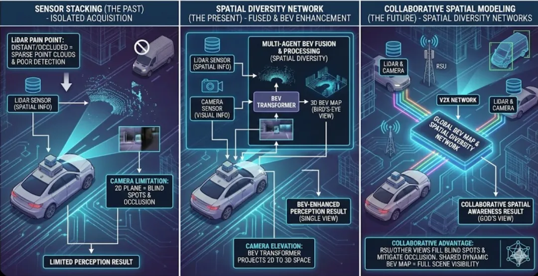 目前的感知技术正在经历一场从传感器堆叠到空间建模的革命。我们不能再把LiDAR和相机看作独立的采集工具,而要看作空间多样性(Spatial Diversity)的传感器网络。