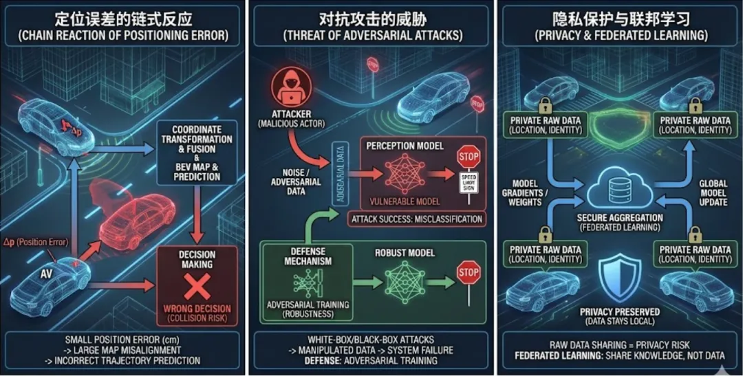 - 定位误差的链式反应: 协同感知高度依赖精准的位姿信息。一旦传感器受环境干扰产生定位偏差(比如几厘米的误差),在进行坐标转换和特征融合时,就可能导致周围车辆位置的预测出现巨大偏移,从而引发错误的驾驶决策,。