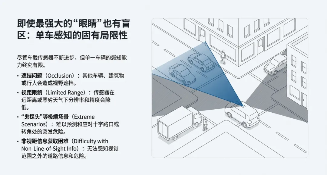 在自动驾驶的讨论圈子里,大家往往习惯性地盯着特斯拉的视觉方案或者国内各家车企的多传感器融合。但坦白说,如果只靠车子本身的那几个传感器,自动驾驶可能永远无法走出“长尾场景”的泥潭。单一车辆的感知局限性极其明显:由于物理遮挡、远距离目标分辨率低,以及转角处的盲区等硬伤,单纯靠“加码”车载硬件,安全性和可靠性的提升正面临严重的物理天花板。