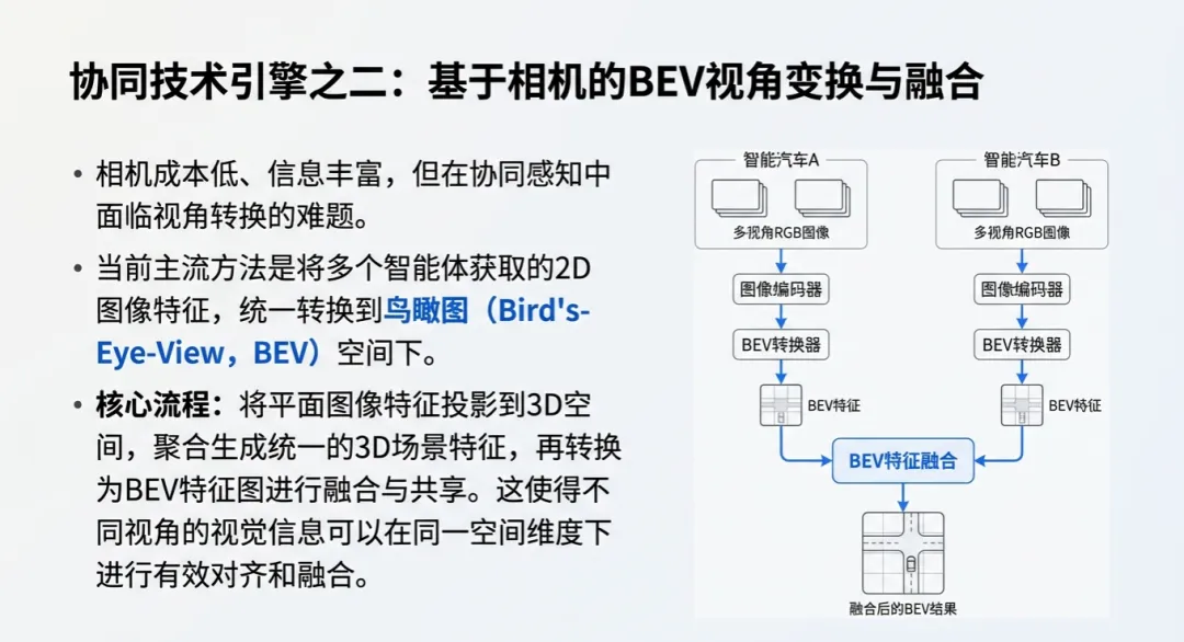 - 相机感知的“升维”: 现在的尖端方法不再满足于2D图像处理,而是将多个智能体获取的图像特征直接转换并聚合到鸟瞰图(BEV)视角中。通过BEV Transformer等技术,平面图像特征被投影到3D空间,形成一份“上帝视角”的动态地图。这种方式的妙处在于,路口的摄像头或LiDAR可以提供高位视角,完美补全车辆在转弯、并线时的视觉盲区。