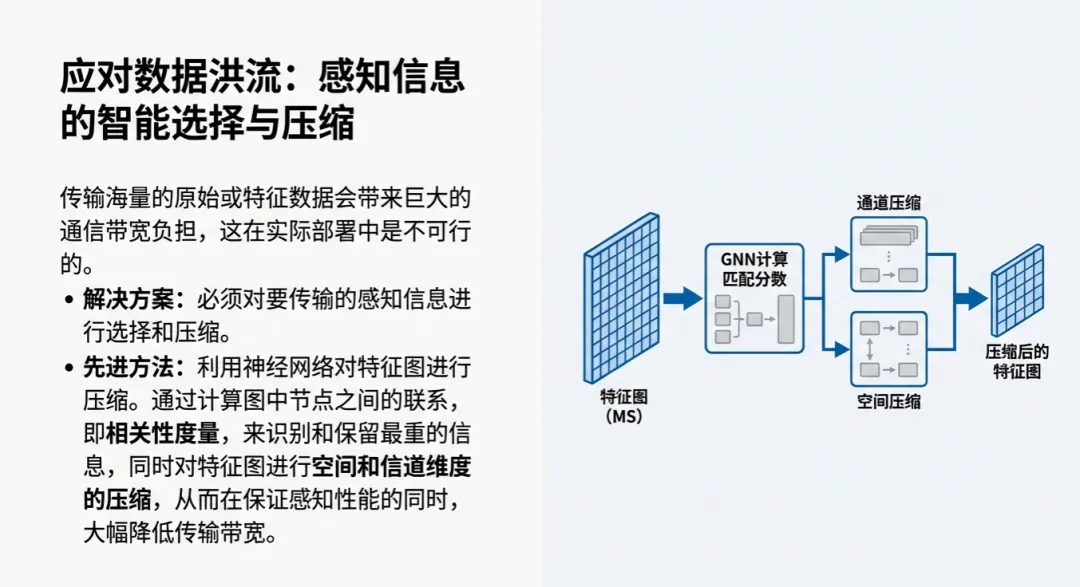 目前的前沿研究利用图神经网络(GNN)来对感知信息进行智能筛选。系统会根据图中节点(感知特征)之间的联系权重,利用通道压缩和空间压缩技术,只传输那些对当前决策“最有价值”的特征。这种在传输前进行的“瘦身”操作,极大地缓解了V2X通信(尤其是C-V2X或5G)的带宽负载压力,。此外,V2I技术通过路侧传感器提供的高视角信息,为系统构建了一个完整、多层次的路况视图,这比单纯依靠V2V(车间通讯)要稳健得多。