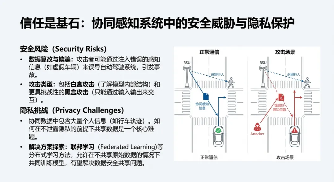 - 对抗攻击的威胁: 恶意攻击者可能通过操纵数据或引入噪声,实施白盒攻击或黑盒攻击。白盒攻击者拥有感知模型的完整信息,而黑盒攻击则通过输入输出进行交互攻击。目前的防御策略主要是将对抗样本纳入训练阶段,即所谓的“对抗训练”,以提高系统的鲁棒性。