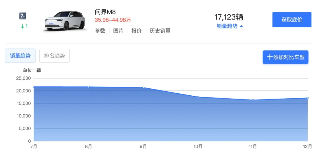 问界M8排名第二,是鸿蒙智行旗下畅销车型之一,于2025年4月上市推出增程版,2025年8月推出纯电版,2025年12月销量17123辆,仅次于蔚来ES8,其中纯电车销量7716辆,增程车销量9407辆。从月度表现来看,问界M8近几个月都未能超过2万,同样凸显大型SUV市场竞争的压力。另一款大型SUV——问界M9排名第四,销量为9208辆,其中纯电动1034辆,增程车8174辆,月销量基本稳定在1万辆左右。