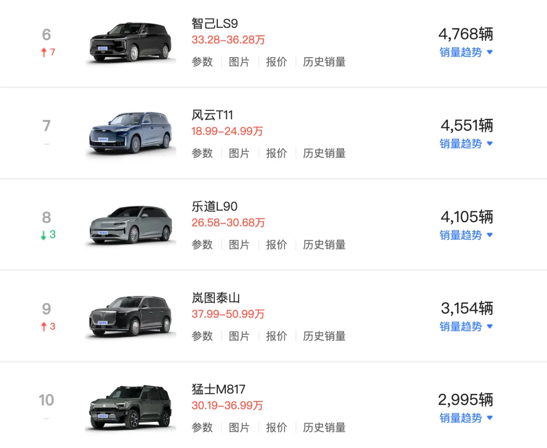 与极氪8X-极氪9X的产品定位类似,腾势N8L于2025年10月上市,与腾势N9共同征战大型SUV市场,但整体表现不如上述的其它产品,2025年12月腾势N8L销量6510辆,腾势N9为2035辆,加起来万辆都不到,勉强够得到极氪9X。