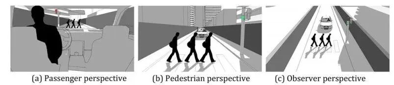 为了研究RQ1,参与者被分配到三种不同的困境视角之一,即:乘客、行人或观察者。不同的视角如图1所示。与[38]相比,我们采用了一种沉浸感较低但更为写实的风格,以验证困境视角是否确实在决策偏好中造成差异。对于每个视角,图像根据a)人数(一人对多人;描绘为一人对三人)和b)交通信号灯的颜色(红灯对绿灯)而有所不同。场景以随机顺序呈现。