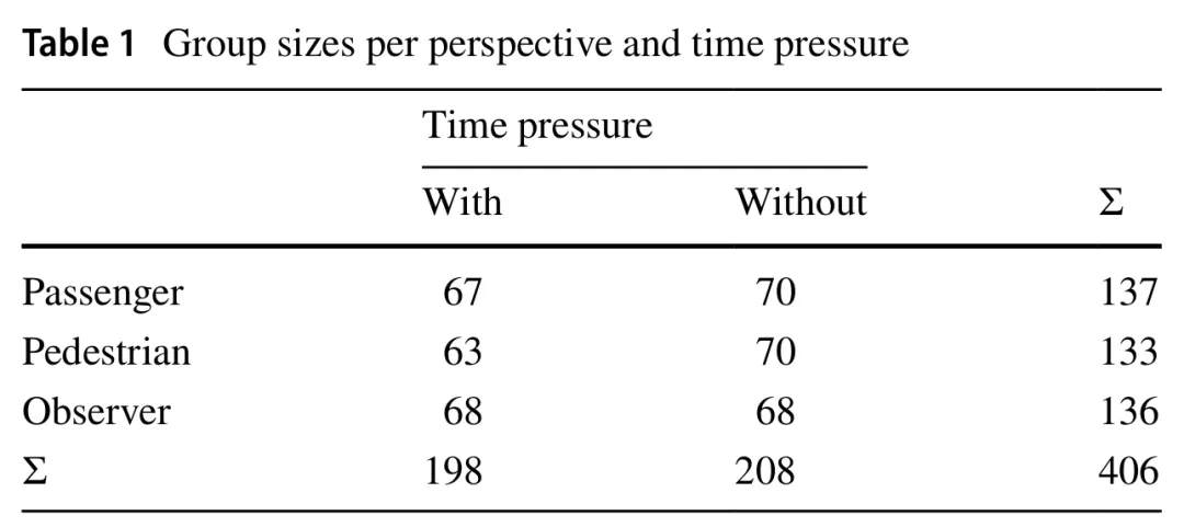 为了设定现实的时间压力,使参与者仍能处理问题的所有细节,我们预先测试了参与者在各种场景下所需的时间。在此预测试(N=15)中,所有受访者在所有视角下的平均作答时间为15.5秒。因此,我们将受限时间组的反应时间强制设定为最多15秒,以制造轻微的时间压力,同时也确保大多数人能在这个时间内完成作答。