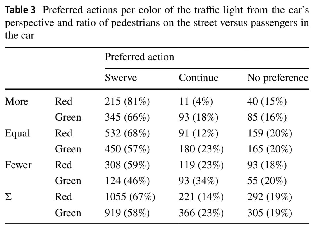 尽管如此,仅仅增加一个决策选项就已经极大地改变了回应,并提供了与现有结果相比更多的见解和细节。这再次让人质疑我们能给予只有两个可能选项的决策场景多大的价值,因为i)在大多数现实世界场景中可能有超过两个选项,以及ii)仅提供两个答案,从而强迫人们做出选择,会导致部分偏差的结果。由于“道德机器”实验和类似结构的调查显式强迫人们做出二元价值判断,即使在不需要或不应做出此类判断的情况下也是如此[57],因此它不是确定可操作行为偏好的合适工具。