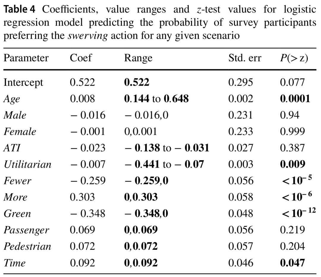 在观察预测转向的模型时,同时满足两个标准的参数是参与者的年龄和功利主义得分、行人和乘客的比例、交通信号灯的颜色以及施加的时间压力。比较这两个模型之间的这些参数,我们可以看到,除功利主义得分外,它们各自系数的符号都发生了翻转,而功利主义得分在预测“继续行驶”行动的模型中未能满足任一选择标准。年龄、交通信号灯颜色以及乘客与行人之间的比例仍然相关,而时间成分略微超过阈值。由于视角似乎对参与者的偏好没有相关影响,我们可以拒绝H1(见表4和表5中的“Passenger”和“Pedestrian”)。然而,H3得到了观察结果的支持,因为时间压力的存在增加了参与者选择转向的概率(见表4中的“Time”)。