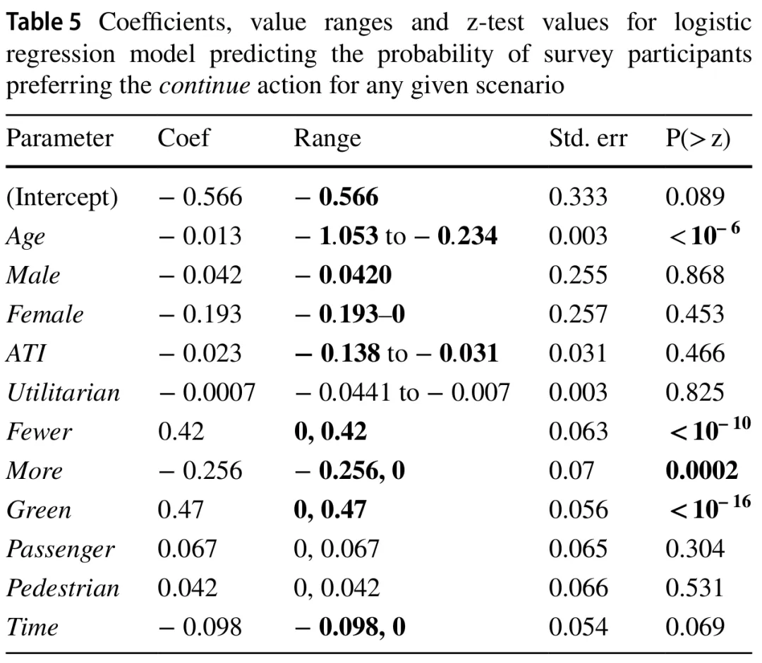 表4和表5分别显示了偏好转向或继续行驶的参数及其伴随的值域、标准误和z检验值。低于0.05的z检验值和幅度超过0.05的值域以粗体显示(注:请参考原文表格)。我们认为同时满足这两个标准的参数是相关的。对于代表多个不同可能选项的分类参数(如红灯/绿灯,或场景视角的乘客/行人/观察者),使用了独热编码。这种类型的建模仅使用N-1个选项作为输入以避免冗余信息。这意味着守法性由“Green”代表,可能的视角由“Passenger”和“Pedestrian”代表。