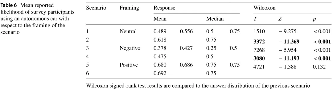 鉴于数据的非正态分布,我们使用威尔科克森符号秩检验来查看哪些回答可被视为具有差异。由于我们设计的顺序效应,我们将当前场景得分与前一个场景的得分进行比较,以调查增加的信息和框架对感知产生了什么影响。在表6中,我们显示了每个场景和框架的归一化平均回答以及统计比较的结果。特别是框架组块之间的威尔科克森结果是相关的,即场景2和3之间,以及场景4和5之间(以粗体显示)。我们发现,尽管所有场景都提到车辆表现出相当性能的现实世界情况,但正面或负面框架对受访参与者的平均回答有显著影响。这从而支持了H6和H7。