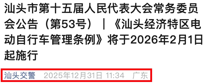 汕头市第十五届人民代表大会常务委员会第35次会议通过了《汕头经济特区电动自行车管理条例》,将在2026年2月1日正式实施,其中详细规范了电动车的登记、上路、停放等要求。