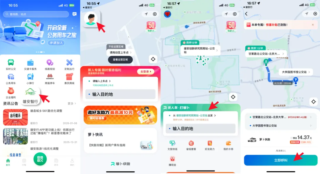 目前新区正在进行商业试点,用户输入起终点后,系统会发放当单可用的优惠价格,不仅如此,萝卜快跑还针对雄安新区推出五折体验套餐和1元超值套餐。