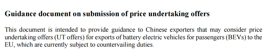 最近,关于欧盟对中国电动汽车“价格承诺(最低进口价)机制”,行业内已经形成了一个相对一致的判断:相比高关税,这是一套更理性、也更可操作的方案。但真正值得讨论的,并不是它“好不好”,而是——它正在把中国电动汽车在欧洲的竞争,从价格博弈,悄然改写为一套新的制度竞赛。这一变化,源于1月12日欧盟发布的《价格承诺方案提交指导文件》。文件明确,在对中国电动汽车征收反补贴税的背景下,允许企业通过“价格承诺(Price Undertaking)”机制,以最低进口价(MIP)替代反补贴税。这并非简单的技术安排,而是一次竞争规则层面的转向。▍01