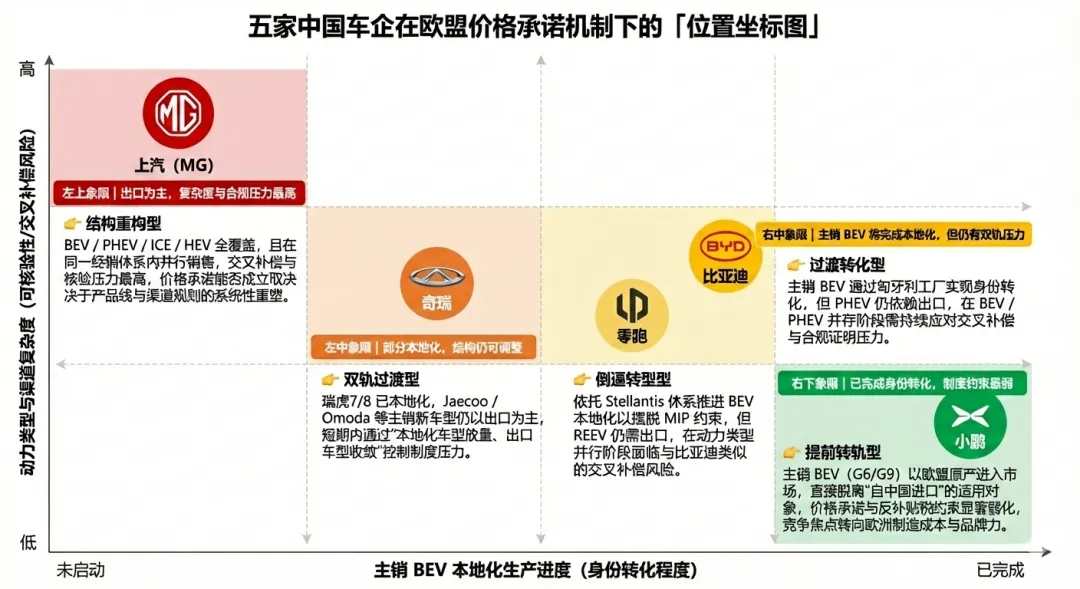 把价格承诺机制放到具体企业身上,中国车企的应对路径已经开始出现清晰分化。这种分化并非立场选择,而是由销量体量、产品谱型,以及本地制造是否覆盖主销车型共同决定的。比亚迪走的是一条明确的“身份转化”路径。比亚迪在欧洲已具备一定销量规模,其匈牙利工厂计划于2026年Q1投产海鸥等车型。对比亚迪而言,价格承诺机制更多是一个过渡期工具:在本地制造全面落地前维持出口窗口;而当主力BEV车型实现欧洲本地生产后,竞争重心将转向本地成本与产品力。需要注意的是,其PHEV车型仍依赖国内出口,在BEV本地化后仍需谨慎处理不同动力类型并存下的交叉补偿风险。上汽(MG)处在“高约束重构区”,且交叉补偿风险尤为突出。MG在欧洲具备较大销量规模,产品覆盖BEV/PHEV/ICE/HEV多种动力形式,同时高度依赖统一的经销商体系与促销激励。这种“多动力并存+同一渠道销售”的结构,使其在价格承诺框架下面临较高的合规与核验成本,并显著放大不同动力车型之间的交叉补偿风险。现实路径更可能是主动收敛产品线、压缩配置层级,并重塑渠道与激励规则,以降低复杂度并提高价格承诺的可执行性。奇瑞处在一个“半本地化、半出口”的过渡位置。奇瑞已在西班牙通过合资工厂生产瑞虎7、瑞虎8,但其部分主力车型——如Jaecoo J7、Omoda 5——尚未实现本地化,且具备ICE/NEV双版本。这意味着,已本地化车型的贸易约束显著降低,而未本地化的BEV车型仍需纳入价格承诺框架。短期内,奇瑞更可能采取“本地化车型放量、出口车型收敛”的双轨策略。零跑属于被制度倒逼、但转型路径明确的一类。其在欧洲的竞争优势高度依赖价格与成本效率,主力车型T03对最低进口价(MIP)高度敏感。不同于单纯出口型企业,零跑能够依托Stellantis在欧洲的生产与渠道体系,明确通过BEV本地化投产来降低对反补贴税与MIP机制的依赖;但与比亚迪类似,其继续出口的REEV等车型仍需谨慎应对交叉补偿风险。小鹏已经进入另一条竞争赛道。通过与麦格纳合作在奥地利进行整车组装,小鹏G6、G9将以欧盟原产身份进入市场。这意味着其欧洲销售不再以“自中国进口”为前提,反补贴税与最低进口价机制对其直接约束显著弱化。其竞争焦点已转向欧洲制造成本、产能爬坡和品牌竞争力。综合来看,一条清晰的分界线正在形成:仍以中国出口为主的企业,需要在价格承诺框架内精细博弈;部分完成本地化的企业,正在“双轨运行”;而完成主销车型身份转化的企业,已进入另一套竞争规则。价格承诺机制,并没有给所有中国车企同一条路,而是加速放大了它们原本就不同的战略选择。▍05