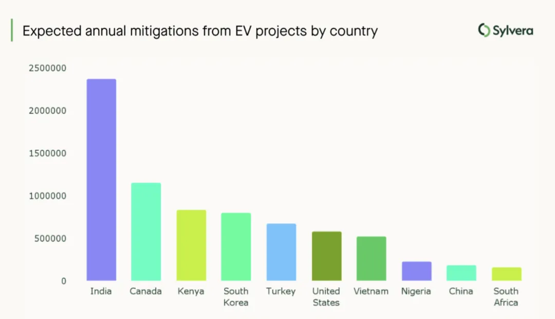 电动汽车项目在亚洲、非洲和北美地区同样备受青睐。从国别来看,印度在电动汽车项目领域占据主导地位,其预计年碳信用核发量是加拿大的两倍以上。