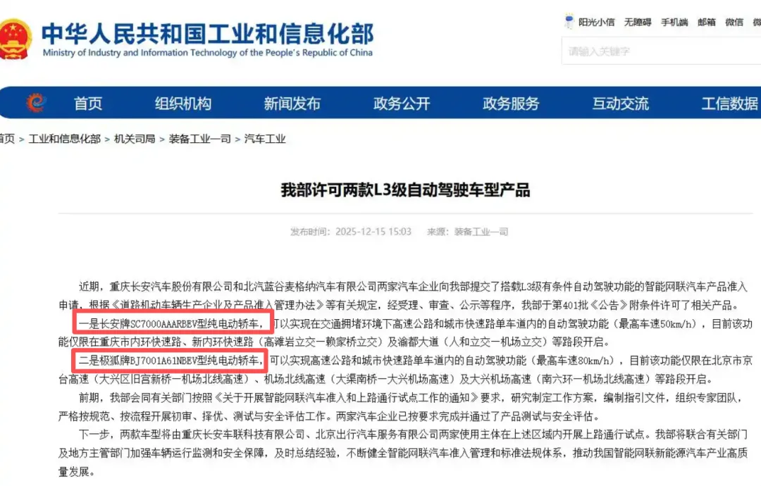 显然,这股自动驾驶的测试风开始于2025年12月15日,工业和信息化部的一纸公告,为这场变革按下了关键的快进键。长安深蓝SL03与北汽极狐阿尔法S系列成为我国首批获得L3级有条件自动驾驶产品准入许可的车型,获准在北京、重庆部分指定道路开展上路通行试点。