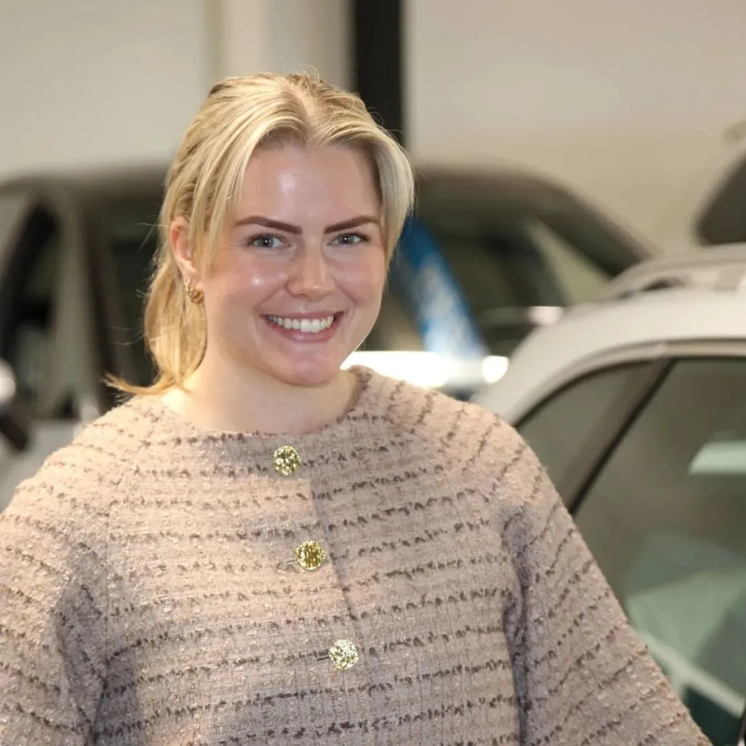 一个女人站在汽车展销会前。她穿着一件米色带扣的夹克,留着长且浅色的头发。背景显示展厅的一部分,里面有颜色各异的汽车。房间里有红色照明和更亮的照明。照片:Øystein Økter / NRK