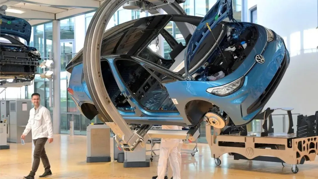 画面显示一座现代化的汽车工厂,一辆蓝色的大众汽车悬挂在起重装置上。一名穿着白色工作服和工作鞋的工人正在处理被吊起的车身。在背景中悬挂着多具车身,厂房有大窗户,让自然光照进来。地板由木材制成,周围可见多处工作站和设备。照片:Matthias Rietschel / 路透社 / NTB