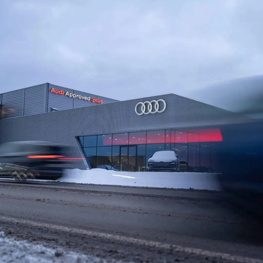 图片显示了一家现代汽车经销商,周围环境被雪覆盖。前方道路上可见两辆车,其中一辆速度较快。建筑的立面以大窗户为特色,并可见奥迪标志。天空多云,光线柔和。
