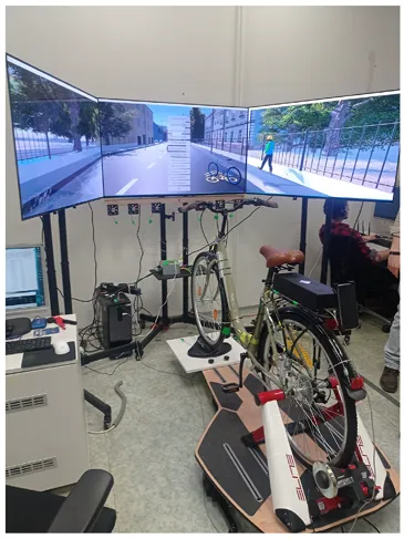 本研究采用了自行车模拟器(图1),实体自行车固定在一个运动平台上,该平台提供6度的倾斜范围。自行车周围环绕三台显示器,用于呈现虚拟环境。该设置为骑行者提供了180度的视野范围,还使用了六个风扇来模拟风感,并播放交通噪声。