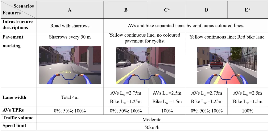 本研究采用自行车模拟器进行实验,研究设计包含共享道路与分离自行车道路场景,并比较不同AV交通渗透率与车道隔离、宽度及颜色等设计特征的效果。通过累积链接混合模型(CLMM)分析参与者主观评分,以评估各因素对骑行者心理感知的影响。