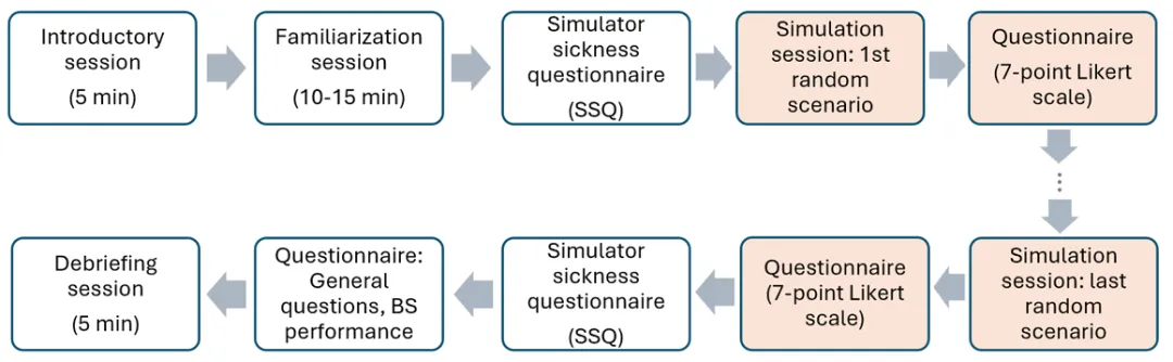 模拟测试阶段,参与者被告知车辆类型,并通过车顶激光雷达识别自动驾驶车辆。每人完成11个随机场景,各场景结束后填写7点李克特量表问卷,并同步记录轨迹、速度、心率与注视行为。