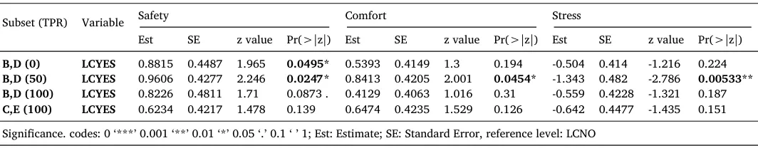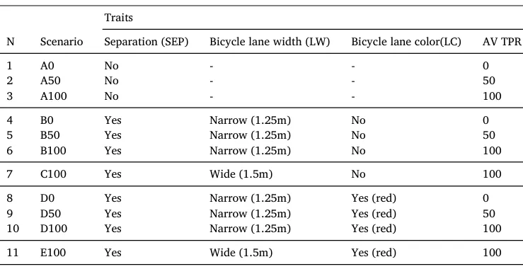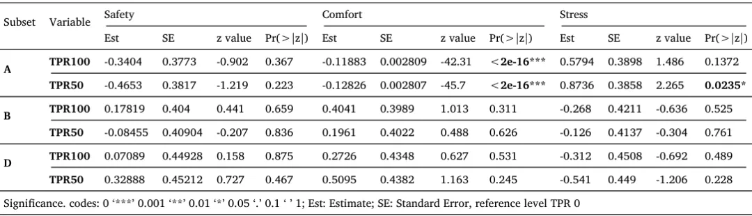 为评估AV交通渗透率的影响,研究对共享道路(A)、无色分隔车道(B)及着色分隔车道(D)场景分别建模。结果表明(表4),在共享道路中,50%与100%的TPR均未显著改变骑行者感知安全,但二者均显著降低了舒适度,且50% TPR 还显著增加了压力感知。