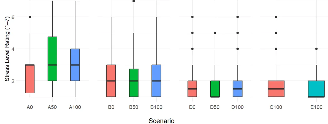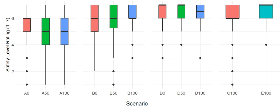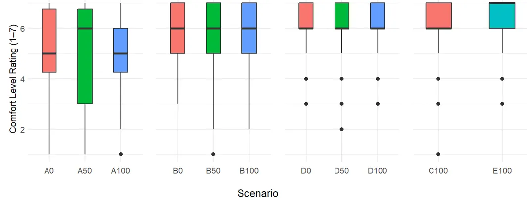 舒适度感知分布(图5)与安全感类似。共享道路(A)评分最低且变异大;无色分隔车道(B)及着色分隔车道(D)场景中位数同为6;而E100(红色、宽车道、100% TPR)被评为最舒适的场景。