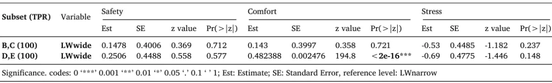 本研究考察了在AV交通渗透率为100%的条件下自行车道宽度的影响。在未着色的自行车道场景中,尽管增加车道宽度提高了安全感与舒适度并降低了压力感知,但这些影响均未达到统计学显著性。在着色自行车道场景中,增加车道宽度对舒适度感知产生了具有统计学意义的积极影响,CLMM的具体分析结果见表7。