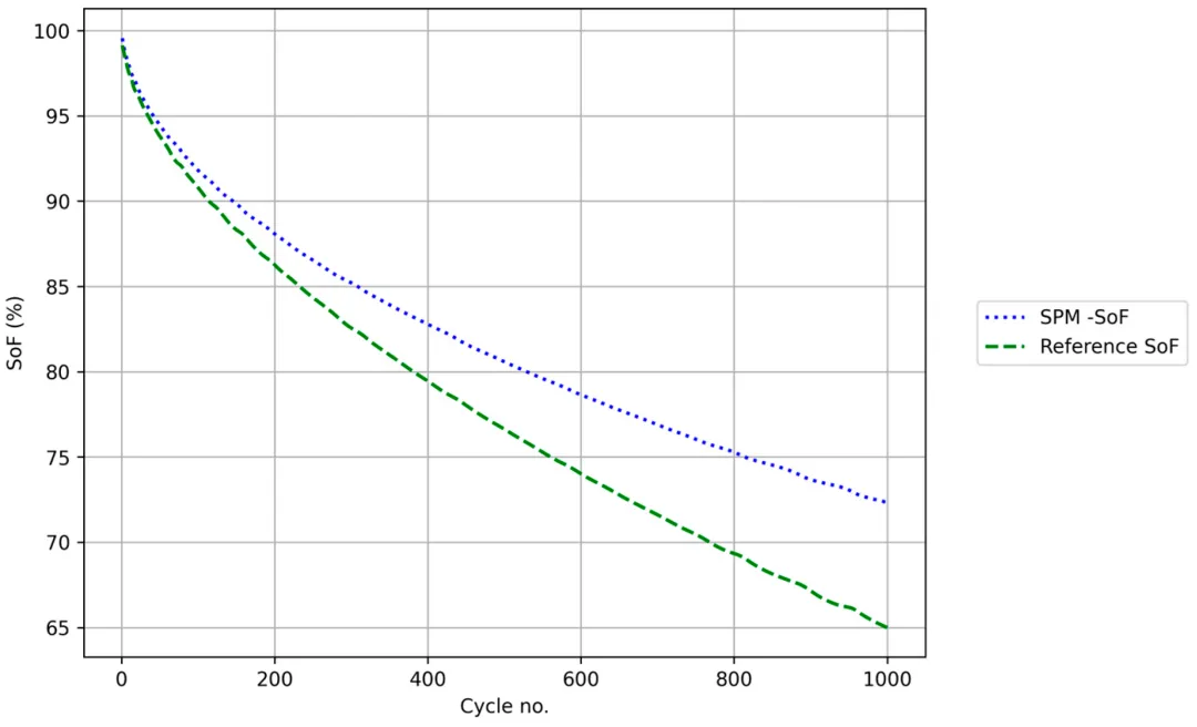 相较于传统基于内阻测量的方法,采用P2D-ROM从电化学计量学角度估计SoF,可将判定电池达到寿命终点 (EoL) 的时间推迟约12%。这直接证明了该模型在延长电池有效使用寿命方面的优势。
