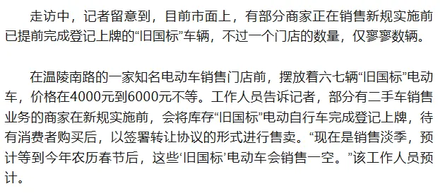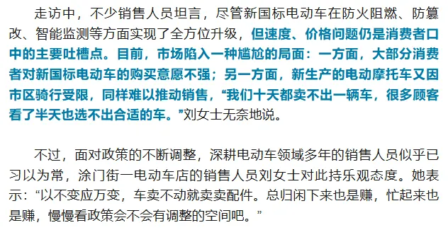 “最近市场低迷,担心新国标产品进货后滞销,暂时未过多引入。”市区义全街某电动车品牌店主向记者分析,新国标实施前夕,部分消费者因担心车型不适用,已出现了一轮集中采购,提前释放了市场需求;再加上冬季原本就是电动车销售的淡季,市场遇冷也在预料之中。“目前新国标车车型有限,厂家主要生产电动摩托车,我们也随之调整了进货。”