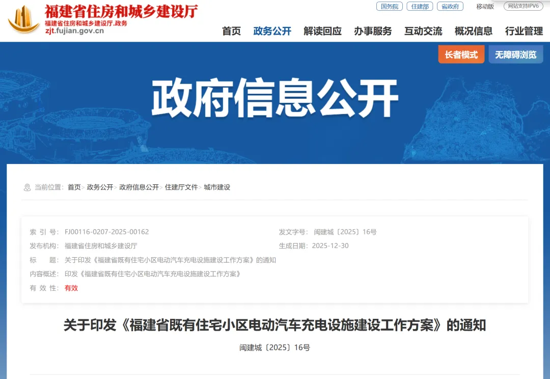 为落实《国家发展改革委等部门关于印发<电动汽车充电设施服务能力“三年倍增”行动方案(2025—2027年)>的通知》(发改能源〔2025〕1250号),系统推进我省既有住宅小区电动汽车充电设施建设,着力破解既有住宅小区电动汽车充电设施建设难题,省住建厅会同省电力公司联合制定了《福建省既有住宅小区电动汽车充电设施建设工作方案》,现印发你们,请认真组织实施。