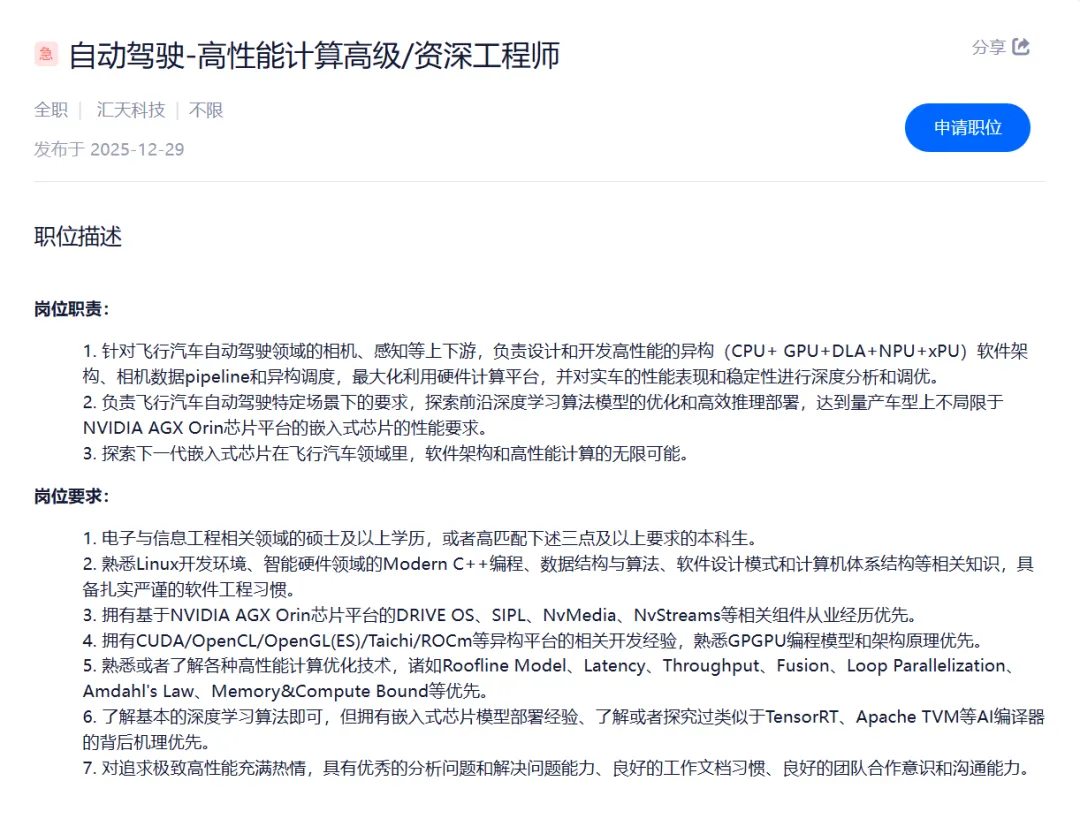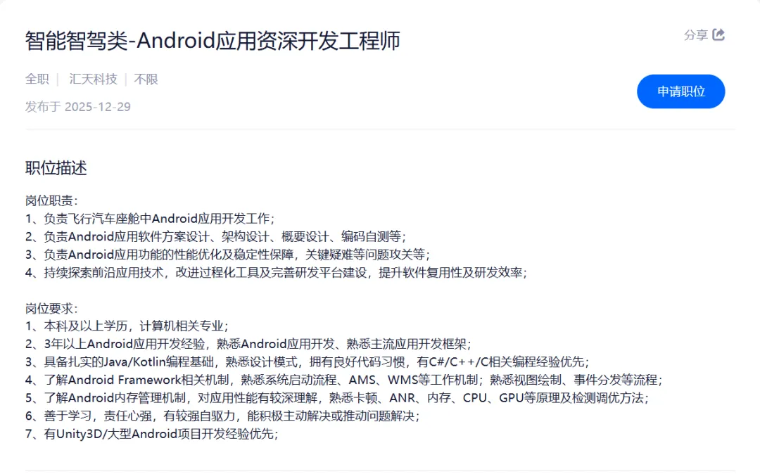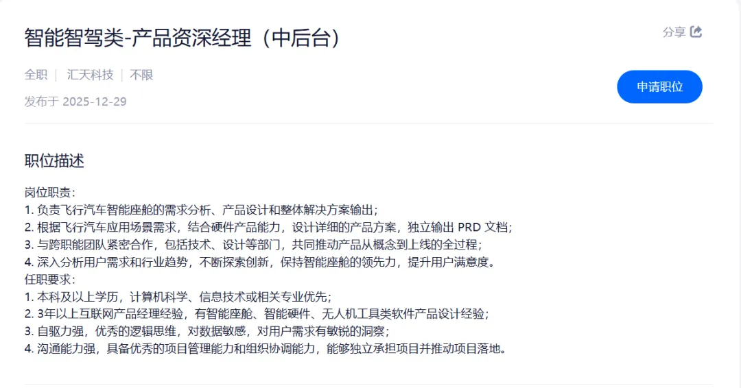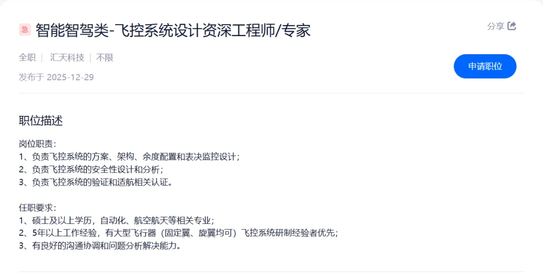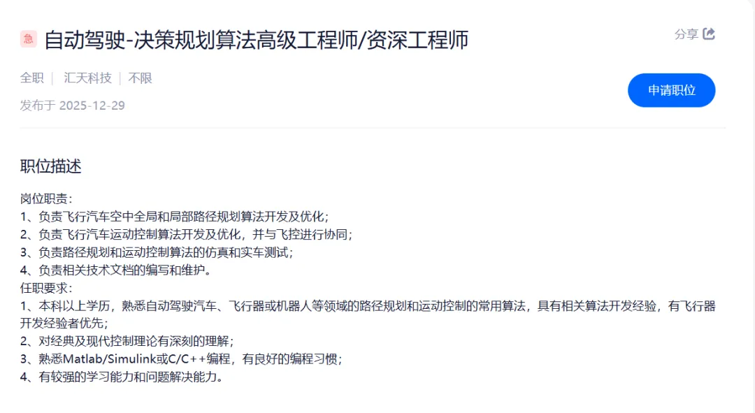小鹏汇天是亚洲规模最大的飞行汽车公司,是小鹏汽车的生态企业。小鹏汇天融合智能汽车与现代航空,致力于为个人用户打造最安全的智能电动飞行汽车,在未来城市空中交通、个人出行、旅游观光等低空领域,为人类城市立体交通提供产品和解决方案。小鹏汇天1月最新急聘岗位,
